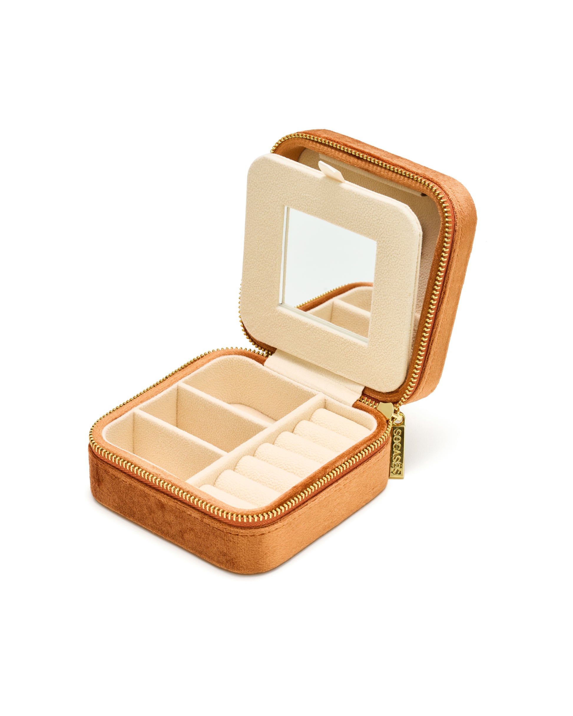 The velvet jewelry boxes from SOCASES are always available in different colors - always with a gold-colored zipper and an interior in beige. The noble velvet cover is not only a real hand-flatterer, but also extremely high-quality and robust. Beautiful for at home on your dresser or dressing table and perfect for travel. The jewelry box can store 3 necklaces, 6 rings or small earrings, 3 bracelets, watches or larger earrings perfectly organized. The integrated mirror is especially useful for putting on jewelry perfectly when traveling. Noble design meets functionality - your jewelry is also protected on-the-go from scratches or the typical "knotting" of necklaces.