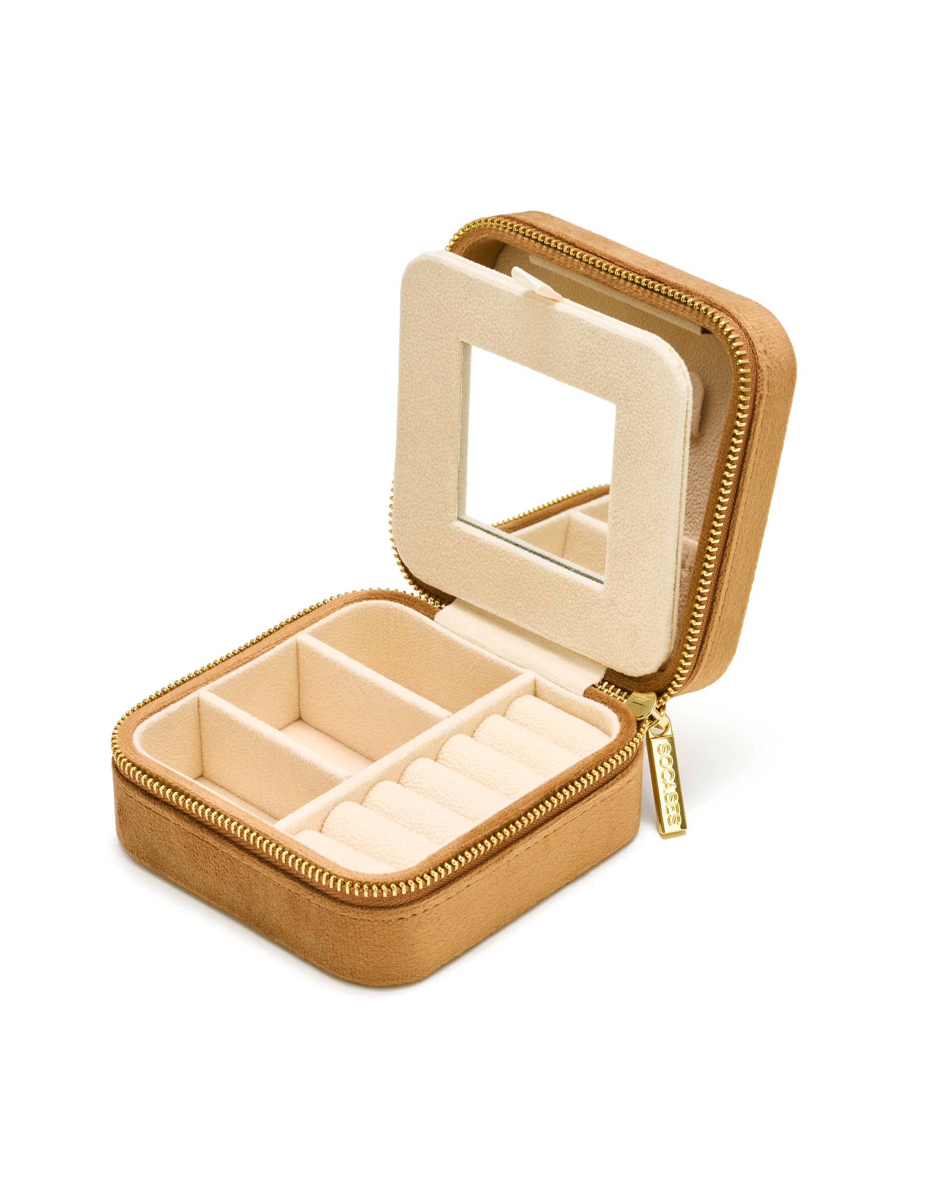 The velvet jewelry boxes from SOCASES are always available in different colors - always with a gold-colored zipper and an interior in beige. The noble velvet cover is not only a real hand-flatterer, but also extremely high-quality and robust. Beautiful for at home on your dresser or dressing table and perfect for travel. The jewelry box can store 3 necklaces, 6 rings or small earrings, 3 bracelets, watches or larger earrings perfectly organized. The integrated mirror is especially useful for putting on jewelry perfectly when traveling. Noble design meets functionality - your jewelry is also protected on-the-go from scratches or the typical "knotting" of necklaces.