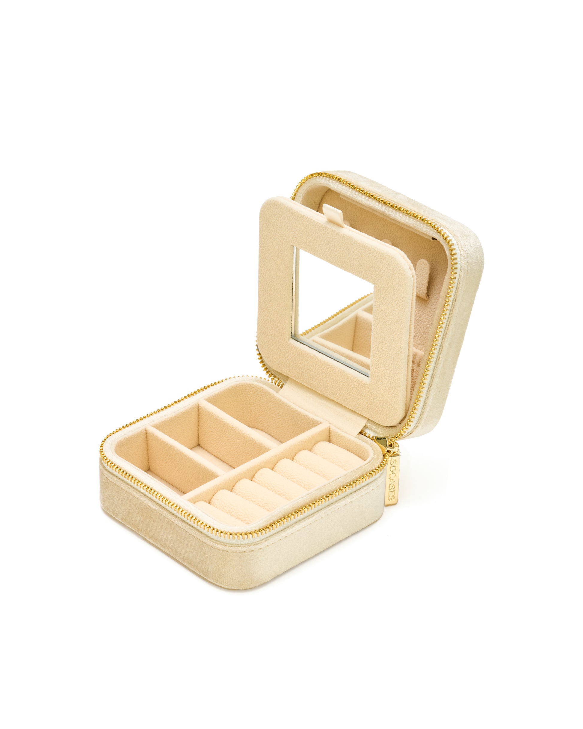 The velvet jewelry boxes from SOCASES are always available in different colors - always with a gold-colored zipper and an interior in beige. The noble velvet cover is not only a real hand-flatterer, but also extremely high-quality and robust. Beautiful for at home on your dresser or dressing table and perfect for travel. The jewelry box can store 3 necklaces, 6 rings or small earrings, 3 bracelets, watches or larger earrings perfectly organized. The integrated mirror is especially useful for putting on jewelry perfectly when traveling. Noble design meets functionality - your jewelry is also protected on-the-go from scratches or the typical "knotting" of necklaces.