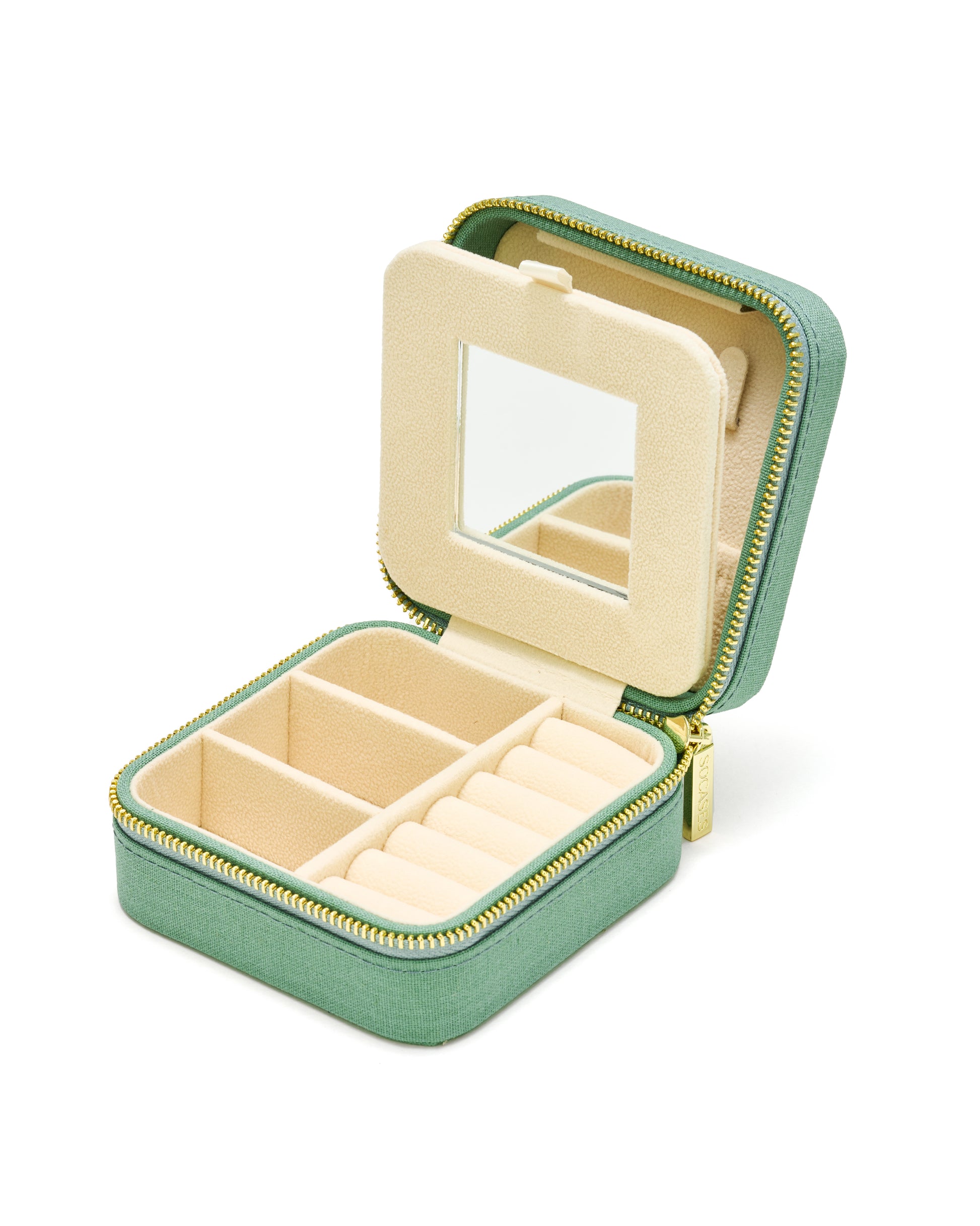 The Linen Edition of the jewelry boxes from SOCASES impresses with timeless elegance and high-quality craftsmanship. The natural linen cover feels pleasant to the touch and gives the jewelry box a modern, minimalist look — perfect for your dresser or vanity at home, and also ideal for travel. Equipped with a gold-colored zipper and a beige interior, it offers optimal organization for up to 3 necklaces, 6 rings or small earrings, as well as 3 bracelets, watches, or larger earrings. The practical integrated mirror makes it easy to put on your jewelry, especially when you're on the go. The elegant design reliably protects your jewelry from scratches and prevents annoying tangling of necklaces — stylish, functional, and always ready to use.